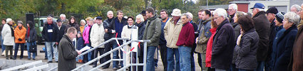 Dann durchschnitten Bürgermeister Blaschke und Martin Ölscher gemeinsam das Band an der Treppe zum Steg. Im Anschluss an die Stegeinweihung wurde ein Gedenkstein zum Erstbesatz mit Stören in die Stör enthüllt. Danach luden die Itzehoer Wasser-Wanderer die vielen Gäste zu Kaffee und leckerem, selbstgebackenen Kuchen auf das Vereinsglände ein. Die Stadt Itzehoe spendete ein Fass Bier. So klang die Einweihungsfeier gemütlich bei Gesprächen rund um die wärmende Feuerschale aus.