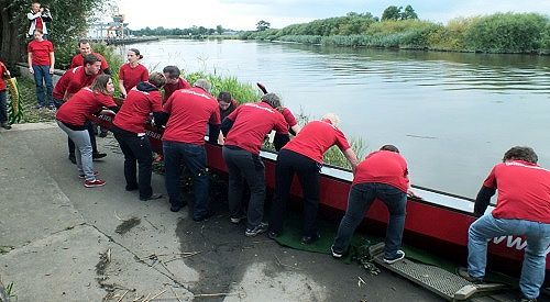 Das kanusportliche Angebot unseres Vereins hat sich erweitert. Vor einigen Jahren haben wir erfolgreich Drachenbootpaddeln in unser Vereinsprogramm aufgenommen. Ein Drachenboot ist 12,50 Meter lang und etwa 250 kg schwer. Das Boot bei Tidenniedrigwasser zu Wasser zu lassen, ist eine anspruchsvolle Aufgabe, die zu dem noch durch die aktuelle Lage der vorhandenen Stegrampe erschwert wird. Das schwere Boot muss um die Ecke herumbewegt werden. Dabei müssen Trägerinnen und Träger auf der schlickigen und daher rutschigen Holzrampe stehen und das Boot sichern. Das derzeit notgedrungen praktizierte Verfahren ist mühsam und das Bootsmaterial leidet (siehe Fotos).