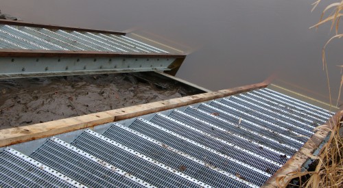 Die ausgewählten Treppenstufen bewiesen an der ersten Treppe ihre Praxistauglichkeit. Die Stufen hatten nach mehreren Hoch- und Niedrigwasserständen fast keine Schlickablagerungen auf den Metallrosten.